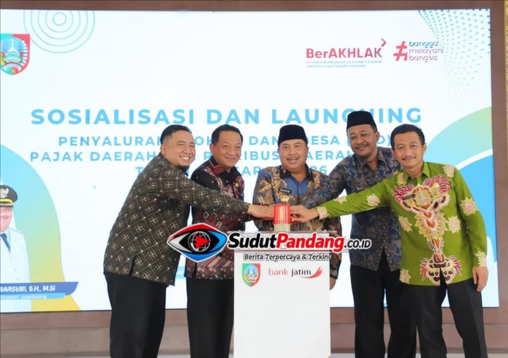 Sudutpandang.co.id – Pemerintah Kabupaten Jombang melalui Dinas Pemberdayaan Masyarakat dan Desa (DPMD) gelar Sosialisasi dan Launching Penyaluran Alokasi Dana Desa (ADD) serta Pajak Daerah dan Retribusi Daerah (PDRD). Dibuka Bupati Jombang Warsubi, bertempat di Pendopo Kabupaten Jombang. Kamis(5/2/26). Dihadiri Sekretaris Daerah Agus Purnomo, Kepala DPMD Sudiro Setiono, Kepala Bapenda Sholahuddin Hafi Sucipto, Kepala BPJS Ketenagakerjaan Ibrahim, Camat dan Kepala Desa se-Kabupaten Jombang.